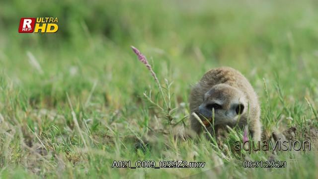 Meerkat feeding on insects and walking out of frame.