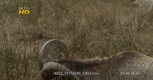 Bighorn sheep looking around and grazing on grass while laying down , during midday. MCU.