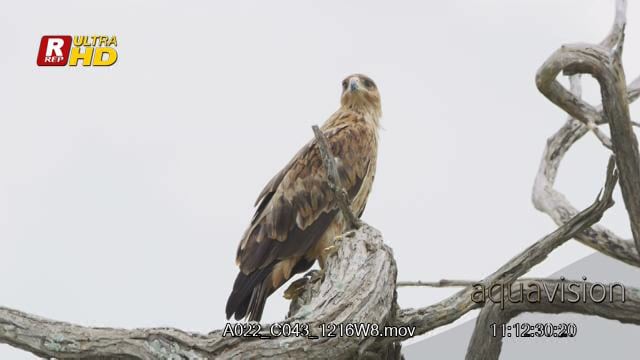 Tawny eagle on a perch and looking down and around.