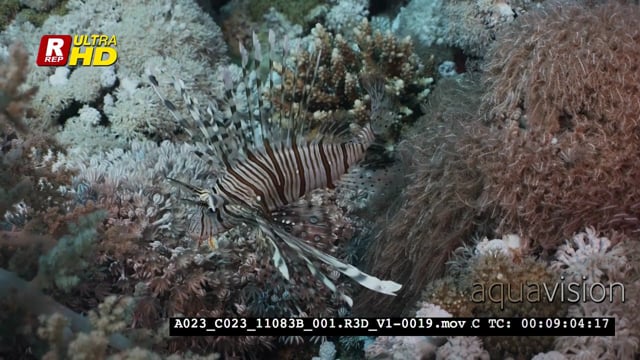 A Close Up of Lionfish, Pterois sp hunting for food over open feeding soft coral on a coral reef.