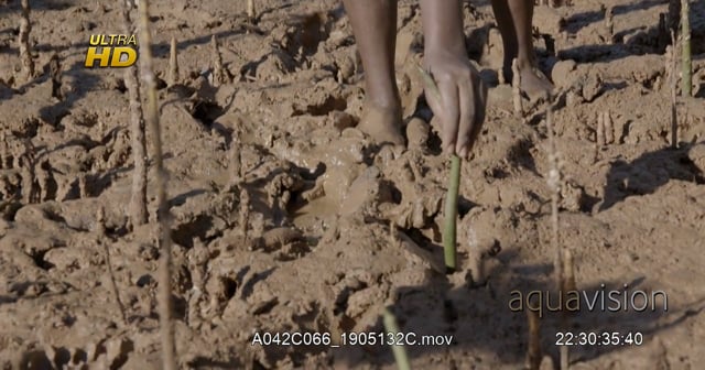 Eden Reforestation Project female partaker standing, planting a mangrove propagules to regenerate.