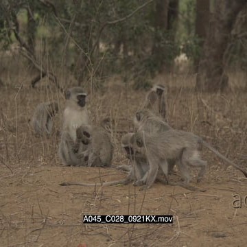 Vervet Monkey troop sitting and moving in woodlands MWS