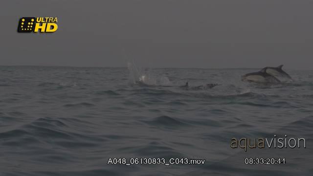 Energetic Common Dolphin pod jumping, breaching and twisting while above water surface.