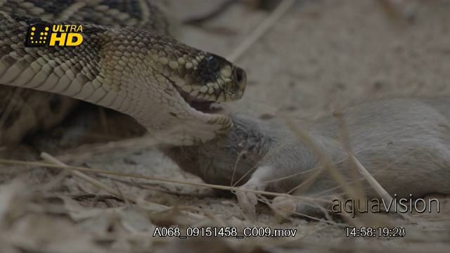 Western diamondback rattlesnake positioning the dead carcass in its mouth.