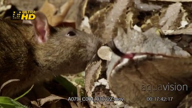 Gaboon viper tries to bite the mouse, slithers backwards and flicks its tongue.