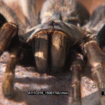 Horned Baboon Spider standing on silk facing camera CU FOCUS PULL