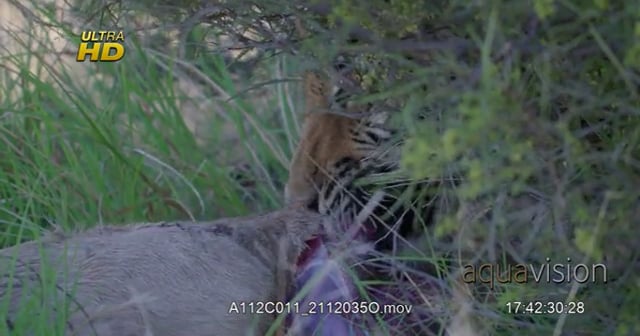 Tiger laying down under the tree and feeding on a carcass.