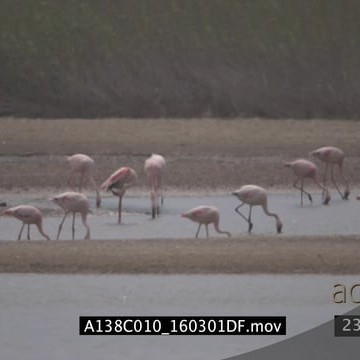 A flock of lesser flamingos in the ocean searching for food HEAT HAZE