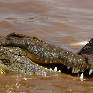 Two female and male Nile Crocodile mating, half of their body above the water surface[water bubbles & ripples]