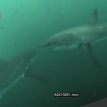 Great White Sharks (2) gently cruising past each other underwater in deep ocean HAND UW