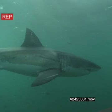 Great White Sharks gently cruising around underwater in ocean passing by camera UW HAND