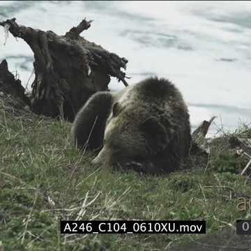 Grizzly Bear looking around and resting on grass by Yellowstone Lake MLS