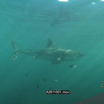 Great white shark gently swimming underwater in ocean passing by camera LA PAN HAND
