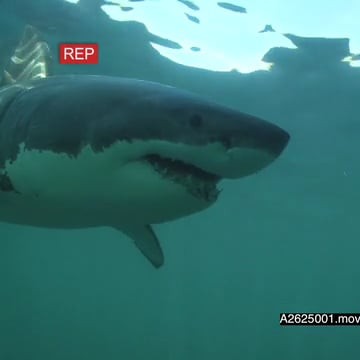 Great white shark gently swimming underwater in ocean passing by camera LA PAN HAND