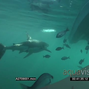 Great white shark gently swimming towards boat underwater in ocean passing by the camera PAN TU LA HAND