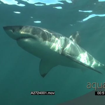 Great white shark gently swimming underwater in ocean passing by camera LA PAN HAND