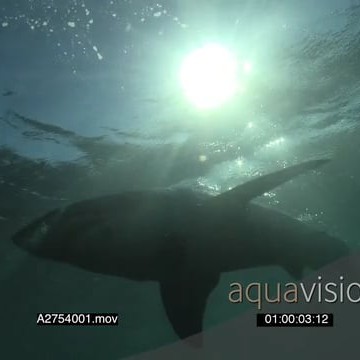 Great white shark gently swimming underwater in ocean passing over camera LA HAND