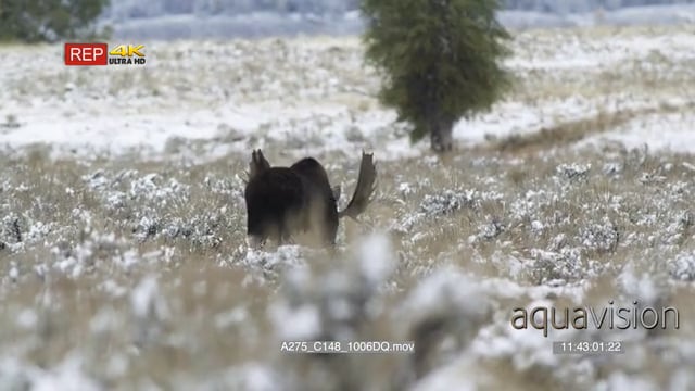 Adult Moose bull back view, walking on prairie and looking around during snow. LS; PAN.