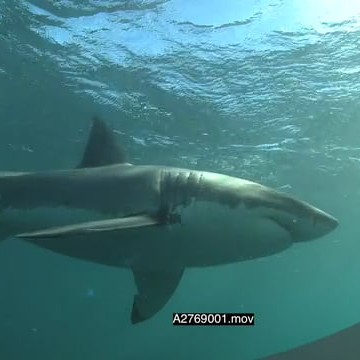 Great White Sharks gently swimming underwater in ocean one in background and the other in foreground bumping a boat LA MWS PAN HAND
