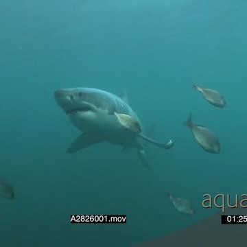 A pair of Great white sharks gently swimming underwater in ocean passing through school of Strepies MWS PAN HAND