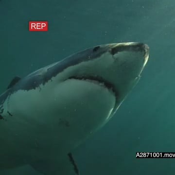 A pair of Great white sharks gently swimming underwater in ocean and one passing over camera LA UW HAND