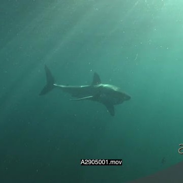 Great white shark gently swimming and turning underwater in ocean then passing by LA PAN UW HAND