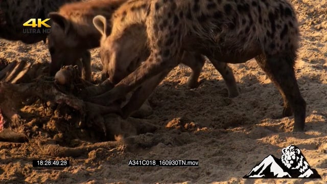 Hyena and Vultures feeding off buffalo carcass.