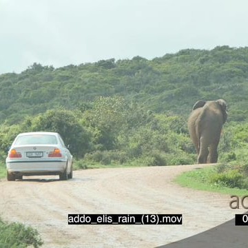 African elephant walking away from vehicle behind on dirt road