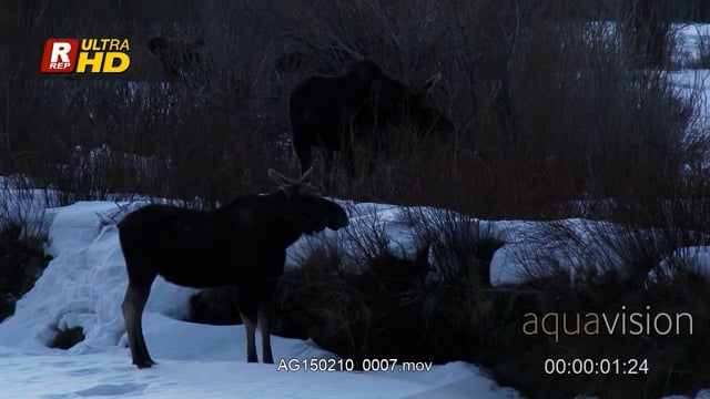 General behaviour of a herd of adult Moose standing in snow and feeding on tree/grass twigs. Late Afternoon, MWS.