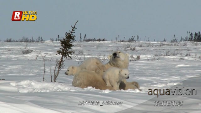 Adult female Polar bear laying down, resting, looking around and her cubs playing.