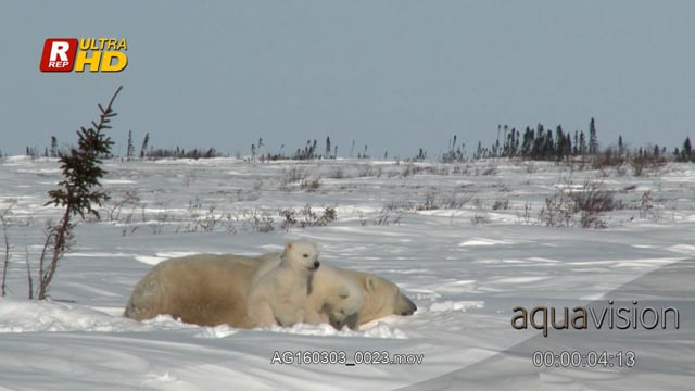 Adult female Polar Bear laying down, sleeping and her cubs digging, playing around.