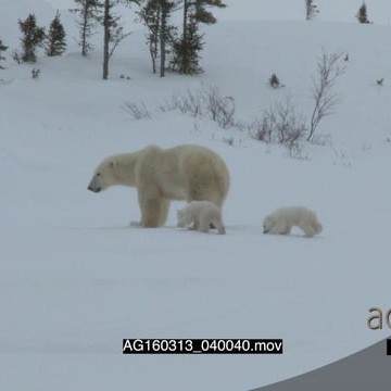 Polar bear mother followed by cubs patrolling investigating area