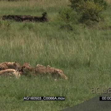 Cheetah (Acinonyx jubatus) family eating from just caught gazelle, Hyena walking around