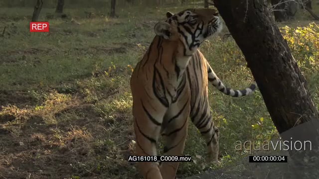 Bengal Tiger patrolling territory, sniffing on a tree FF GOOD LIGHT AmCam