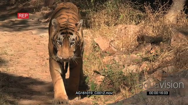 Bengal tiger walking on a dirt road HANDHELD AmCam
