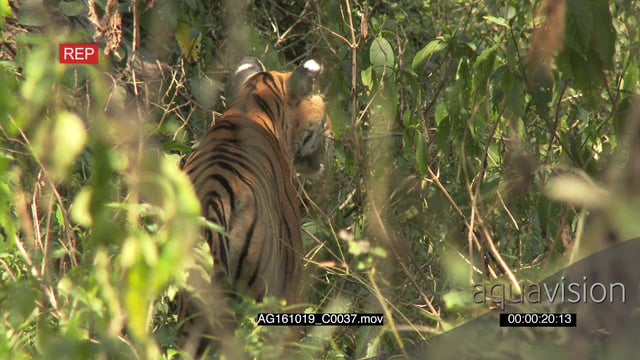 Bengal tiger patrolling territory, stalking in green woodland PROFILE AmCam