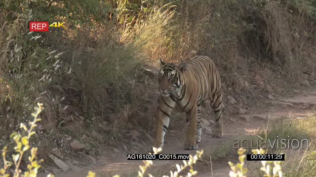 Bengal Tiger patrolling territory on a dirt road AmCam