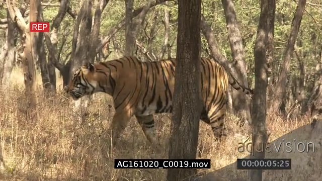 Bengal tiger patrolling territory, hunting dry woodland. AmCam