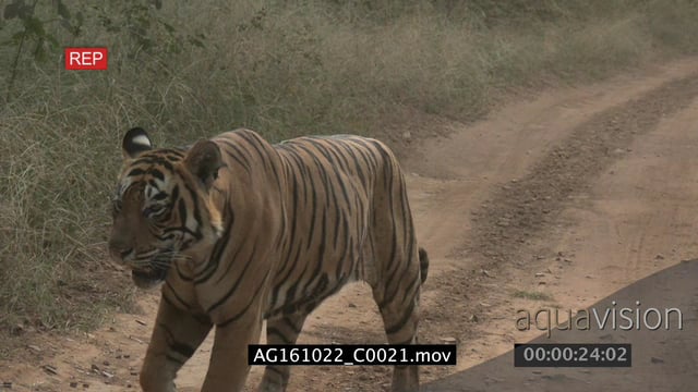 Bengal Tiger patrolling territory on a dirt road, hunting AmCam