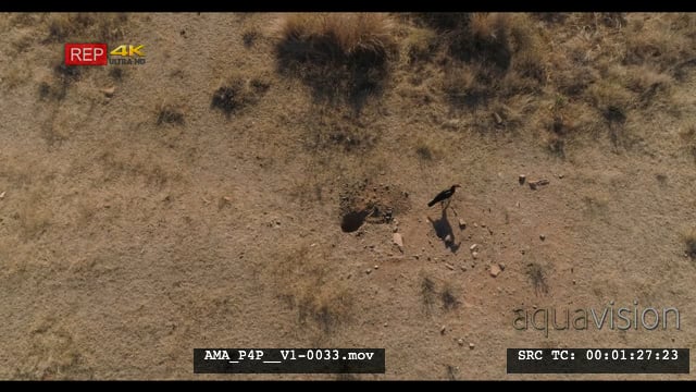 Aerial Drone Southern Ground Hornbills foraging digging in burrow for food