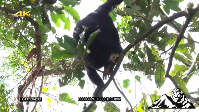 Chimpanzee on a tree swinging on a tree and picking up fruits to feed on.