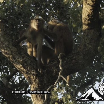Two chacma baboons grooming on a tree LA