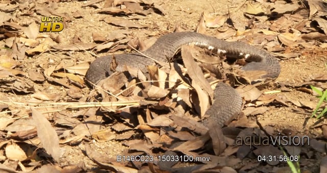 Rinkhals snake hunting, flattened head and slithering off frame.