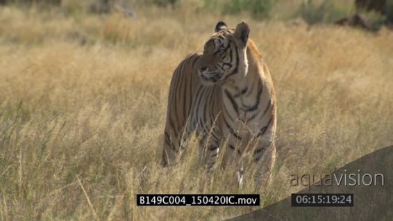 Bengal Tiger patrolling and scouting around in dry tall savannah grassland WS PAN