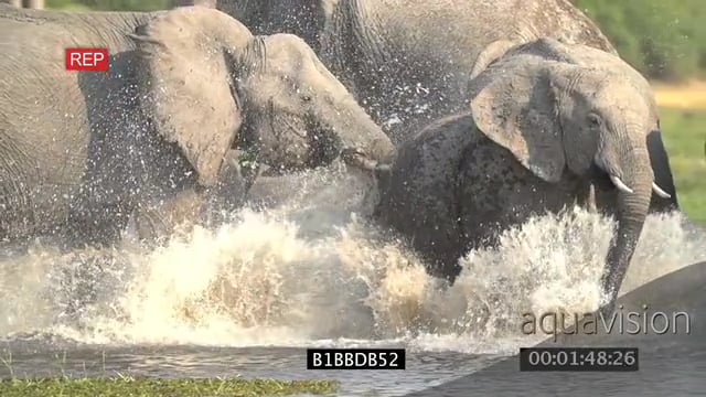 African Elephant herd drinking aggressively running chasing each other in water SLOWMO