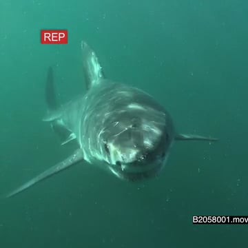Great white shark gently swimming towards camera underwater in ocean then turning and passing by LA UW HAND