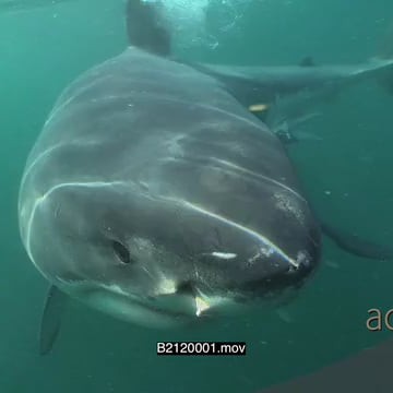Great white shark gently swimming around a bait line underwater in ocean then turning back MS PAN CU HAND
