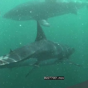 A pair of Great white sharks gently swimming and turning underwater passing by camera and school of Cape Silversides UW HAND