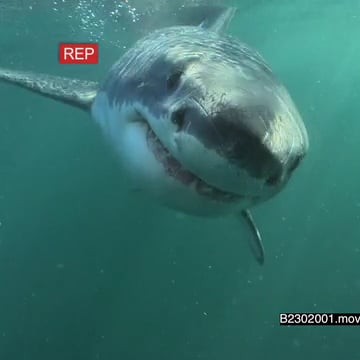 School of Cape Silversides swimming underwater in ocean then Great white shark gently passing through them and biting camera going out of the blue UW HAND
