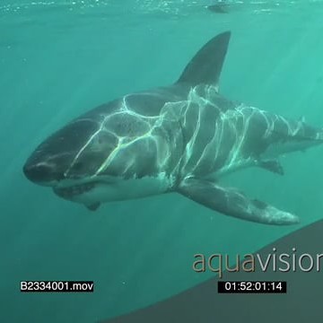 Great White Shark swimming underwater in ocean turning and passing by camera UW HAND